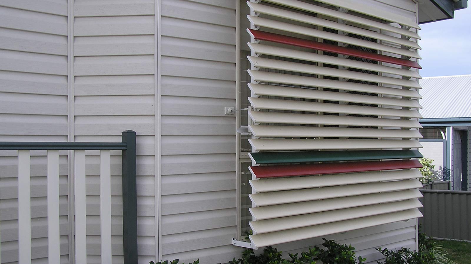 Adjustable louvred awnings provide a permanent solution to control the sometimes extreme local climate.