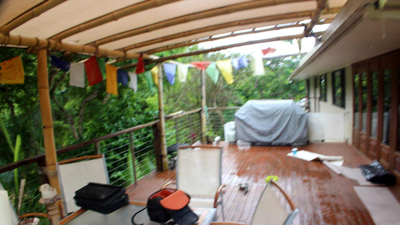 The existing deck area before the job. Rain through the semi-permanent roof structure reduced the usability of the outdoor area.