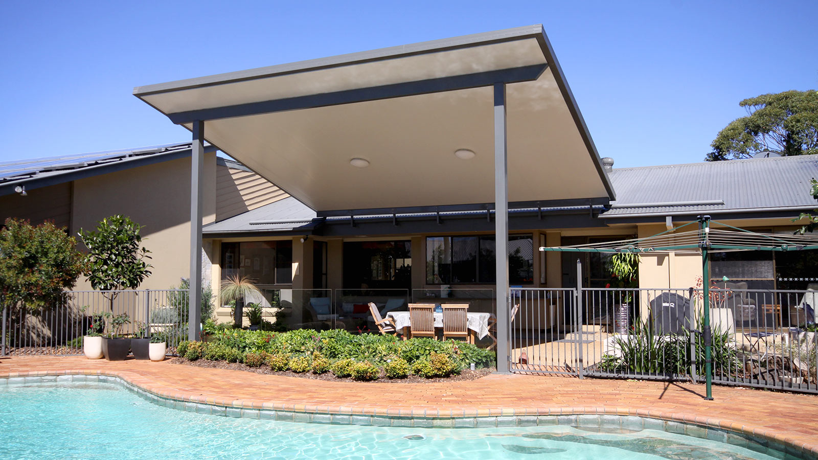 This beautiful flyover patio roof provides a cool shady area to relax and entertain, without the feeling of being trapped indoors.